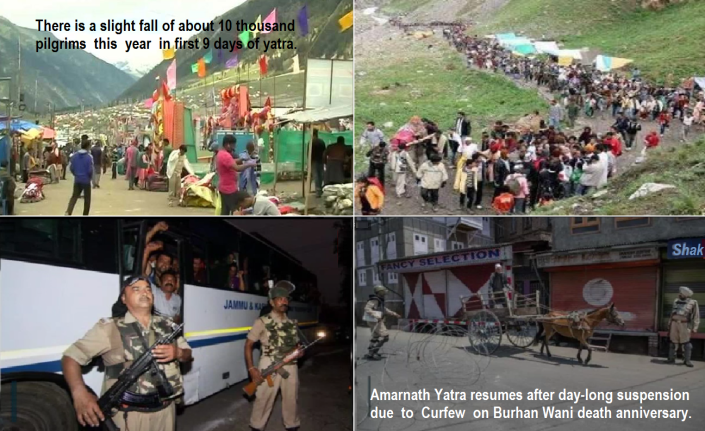 “Due to security reasons, the Yatra was suspended on Saturday,”officials said. Amarnath Yatra was suspended from Jammu due to curfew in valley+ imposed to control the situation of unrest apprehended on the 1st Burhan Wani death anniversary. Burhan Wani, a Hizbul terrorist was died in an encounter at Kokernag on 8 July 2016.