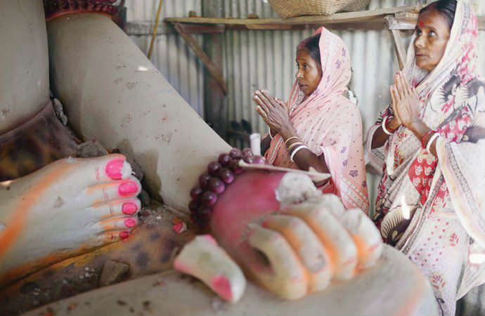 Two Hindu women are seen offering devotion before an idol of Lord Shiva broken by the Jihadis .(Tribune File Photo)