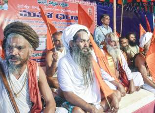 Sadhus from various parts of the country stage a protest in Vijayawada on Friday demanding rebuilding of temples which were demolished during Krishna Pushkarams | Pic. R V K RAO.