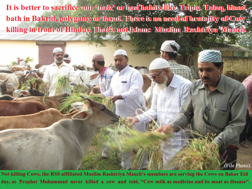 PNS | Lucknow | Aug 30, 2017:: RSS-affiliate Muslim Rashtriya Manch (MRM) asked Muslims to refrain from animal sacrifice on Bakrid likely to be celebrated on September 2. Instead, the Manch advised that Muslims should sacrifice their ‘nafz’ or bad habits.