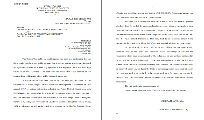 Hon’ble Calcutta High Court has been pleased to pass an order that Government of West Bengal is to by today evening (1st Sept 2017) and tomorrow (2nd Sept 2017) morning advertise in all media making people aware of prohibition of slaughter vide previous judgments passed by the Hon’ble Calcutta High court and Hon’ble Supreme Court of India and the restrictions prohibiting such an activity by ACT and Rules namely WEST BENGAL ANIMAL SLAUGHTER CONTROL ACT , 1950 and PREVENTION OF CRUELTY TO ANIMALS (SLAUGHTER HOUSE) RULES,2001.