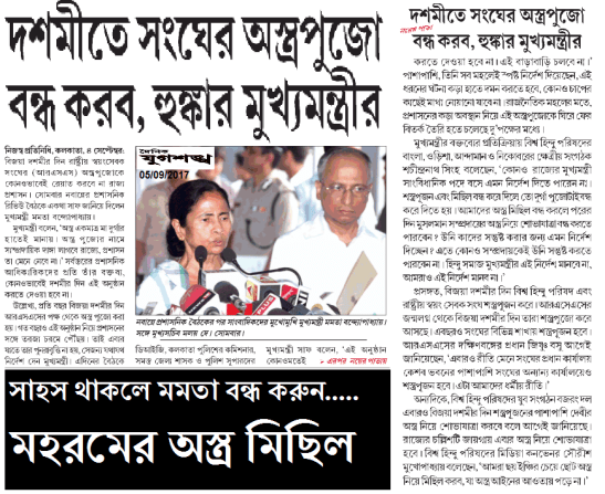 It is interesting that Mamata Banerjee is restricting Vijaya Dashami of Hindus and Shastra Pujan by the Saffron Cadres, but she is not taking any action against the Weapon wielding Muharram processions all over Bengal including Kolkata in the very next day of Vijya Dashmi.