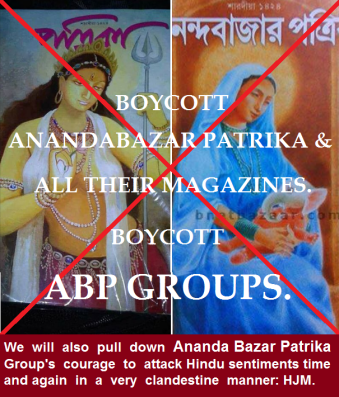 While talking to Vimal Dwivedi, the Regional Regional Secretary of the Hindu Jagran Manch, Uttar Pardesh, Dwivedi told HENB, “We have noticed such derogatory and sacrilegious Front covers in  some Durga Puja Anuual Number Bengali Magazines published by Ananda Bazar Patrika Group. Hindu Jagran Manch and VHP protested the issue in last month in Kolkata. Police attacked that protest rally and the Media House did not make any apology even. We will also see the matter in UP or elsewhere to pull down their courage to attack Hindu sentiments in a very clandestine manner”.
