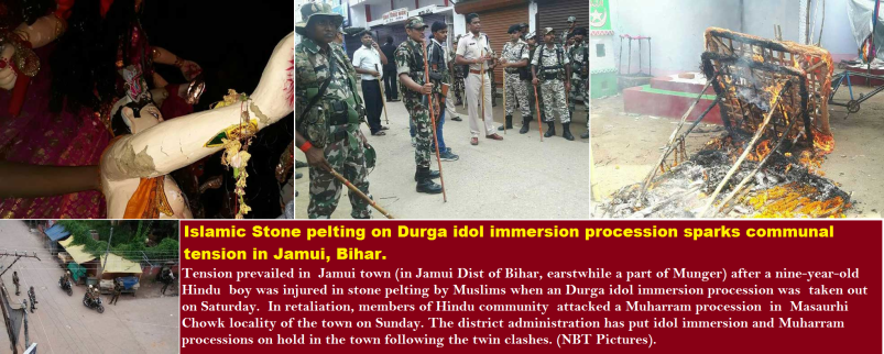 Debashish Karmakar and Kashi Prasad | TNN | Patna and Munger | Oct 2, 2017:: Tension prevailed in Jamui town after a nine-year-old boy from a majority community was injured in stone pelting when an idol immersion procession was taken out on Saturday. In retaliation, members of majority community attacked a Muharram procession in Masaurhi Chowk locality of the town on Sunday. The district administration has put idol immersion and Muharram processions on hold in the town following the twin clashes.