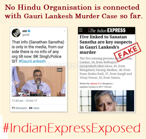 HJS Media | Bengaluru | Oct 14, 2017:: The Special Investigation Team (SIT) probing the case of killing of Gauri Lankesh held a press conference today in Bengaluru. In this press conference, the Head of SIT, Inspector General of Police Mr. B.K. Singh clarified “The information that Sanatan Sanstha is involved in the killing of Gauri Lankesh rests only with the media. We do not have any such information with us”. This goes to show that some anti-Hindu elements and few media houses are purposefully trying to implicate Sanatan Sanstha in the killing of Gauri Lankesh, and thus defame the Sanstha.