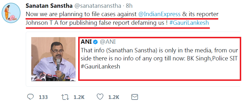 At the outset, we congratulate SIT for presenting the fact without succumbing to the pressure from any quarters. Some anti-Hindu elements and few media houses were trying to connect Sanatan Sanstha in the killing of Gauri Lankesh from the very first day despite the absence of any evidence and even after the clarification made by Sanatan Sanstha. They have purposefully tainted the image of Sanatan Sanstha in the society. Sanatan Sanstha is taking advice from lawyers so as to initiate legal action against the concerned.