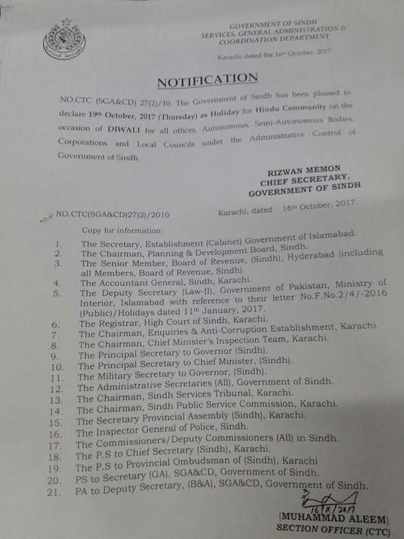 According to a notification issued by the provincial government, all Hindu employees of autonomous, semi-autonomous and local councils under the administrative control of Sindh will be given holiday on Oct 19 on the occasion of Diwali or the festival of lights.