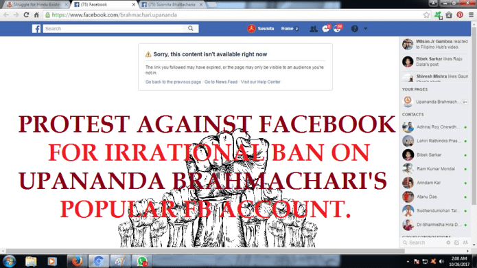 Susmita Bhattacharia | HENB | Kolkata | Oct 26, 2017:: The popular #FaceBookAccount of Hindu Existence Editor and Prominent Hindu Interlocutor Upananda Brahmachari has been disabled by #IrrationalFaceBook Authority. Though Brahmachari sufficiently sent his identity proof, the FaceBook authority has not taken any positive decision to restore the concerned account of Brahmachari.