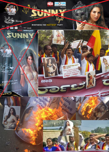 The entire controversy first started when members of Kannada based right wing party Karnataka Rakshana Vedike Yuva Sene+ had protested against Leone performing in Bengaluru. Their contention was that she represented everything that is against the culture of their state, and if the event is allowed to happen, they would perform mass suicides on the day. Their protests were supported by Karnataka Home Minister.