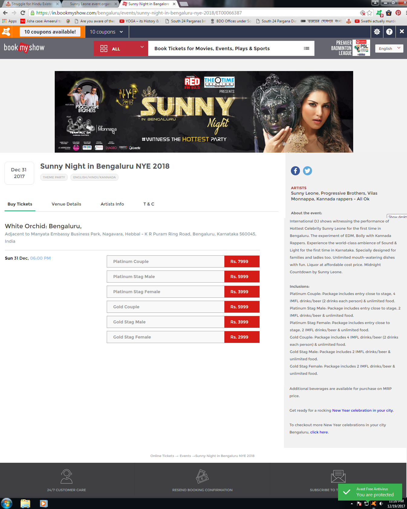 In the controversial programme of Sunny Leone the organizers announced huge arrangements through payments for such package “includes 4 IMFL drinks/beer (2 drinks each person) & unlimited food” with semi nude dance with  musical treat.