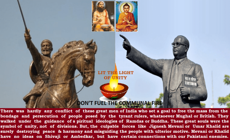 The perpetrators like Mevani, Khalid or Prakash Ambedkar were obviously successful to make a crafted division between the ‘people of Chatrapati Shivaji’ and the ‘people of Bhimrao Ambedkar’. But, there was hardly any conflict of these great men of India who set a goal to free the mass from the bondage and persecution of people posed by the tyrant rulers, whatsoever Mughal or British. Shivaji and Ambedkar both were the champion of oppressed people. They both walked under the guidance of spiritual ideologies of Smarth Swami Ramdas or Gautam Buddha. These great souls were the symbol of unity, not of divisions. But, the culpable forces like Jignesh Mevani or Umar Khalid are surely destroying the peace and harmony and misguiding the people with ulterior motive. Mevani or Khalid have no ideas on Shivaji or Ambedkar, they have no roots in Indian spirituality or ideologies but have certain connections with our Pakistani enemies.