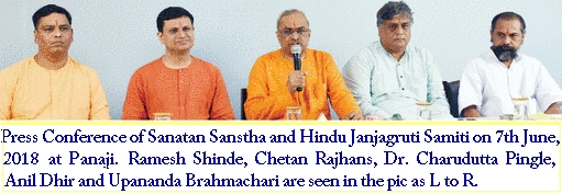 Upendra Bharti | HENB | Ramnathi (Goa) | June 7, 2018:: Hindu Rashtra is a right of the Hindu majority of India. The Seventh All India Hindu Convention was held to provide ideological as well as practical directions to achieve this. The convention which concluded recently, saw enthusiastic participation from pro-Hindu delegates from across the nation. The delegates in the convention passed a number of resolutions including the demand to declare India and Nepal as Hindu Rashtra. Sadguru (Dr.) Charudatt Pingale (national guide, Hindu Janajagruti Samiti) said that the convention was attended by more than 375 delegates of over 175 organizations, from 18 states of India as well as Nepal, Sri Lanka and Bangladesh. He was speaking during the Seventh All India Hindu Convention’s closing press conference. Shri. Anil Dhir (National Secretary, Bharat Raksha Manch), Shri. Upanand Brahmachari (Editor, Hindu Existence), Shri. Chetan Rajhans (National Spokesperson, Sanatan Sanstha) and Shri. Ramesh Shinde (National Spokesperson, Hindu Janajagruti Samiti) were also present during the press conference.