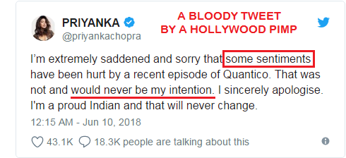 “I’m extremely saddened and sorry that some sentiments have been hurt by a recent episode of Quantico. That was not and would never be my intention. I sincerely apologise. I’m a proud Indian and that will never change,” Priyanka tweeted.