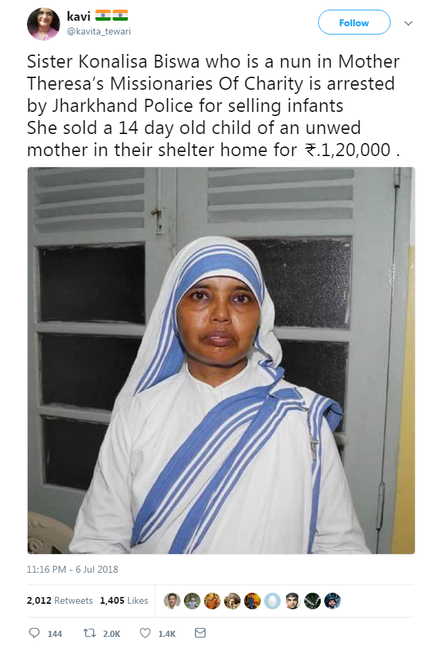 Upendra Bharti | HENB | Ranchi | July 4, 2018:: At least one sister of ‘Missionaries of Charity+’ of ‘Mother Teresa+’ [1] [2] [3] [4] [5] [6] [7] [8] in Ranchi was arrested for her involvement in the illegal trade of children after taking a huge amount of money from the couples keen to adopt children.