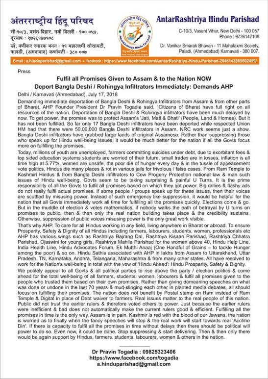 In a press release, AHP demanded the “Immediate Deportation of Bangladeshi/Rogingya Infiltrators” from India and it criticized the failure of BJP run Assam Govt to take right steps to solve the problems of Muslim influx in Assam. AHP also objected the unfortunate stay of Hindus in many detention camps in Assam, treating them equal to Muslim infiltrators.