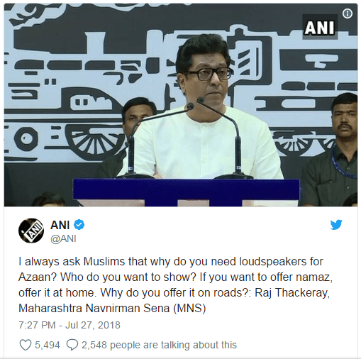 Preeti Malondkar | HENB | Mumbai | July 28, 2018:: Maharashtra Navnirman Sena (MNS) chief Raj Thackeray on Friday questioned the use of loudspeakers for azaan and advised the Muslims to offer ‘namaz’ at home so that nobody is disturbed.