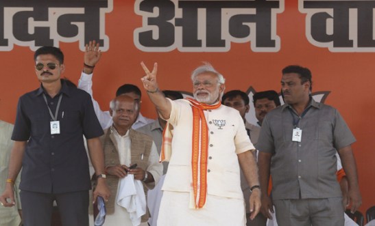 Indias main opposition and Hindu nationalist Bharatiya Janata Partys prime ministerial candidate Narendra Modi displays the victory symbol during an election campaign rally in Varanasi, in the northern Indian state of Uttar Pradesh, Thursday, May 8, 2014. Varanasi will go to the polls on May 12, the final day of voting, with Modi running from the constituency. (AP Photo/ Rajesh Kumar Singh)/ Caption by Associated Press.