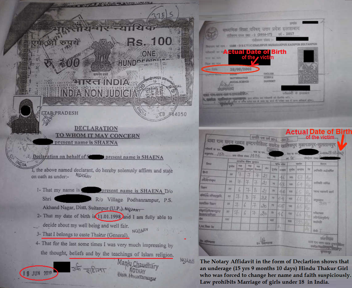A Document (a notary affidavit in a form of declaration of the minor girl as on 18/06/2018) shows that the Hindu Thakur girl changed her faith and name at the age of 15 years 9 months and 10 days which is highly illegal and makes the notary ultra vires.