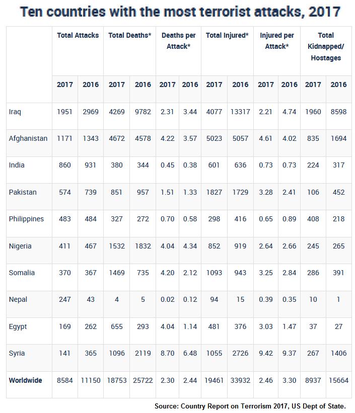 “The frequency of terrorist violence by Maoist extremists in India declined between 2016 and 2017 with respect to number of attacks (from 338 in 2016 to 295 in 2017); however, the number of people killed increased 16%, and the number of people injured increased 50%,” it said.