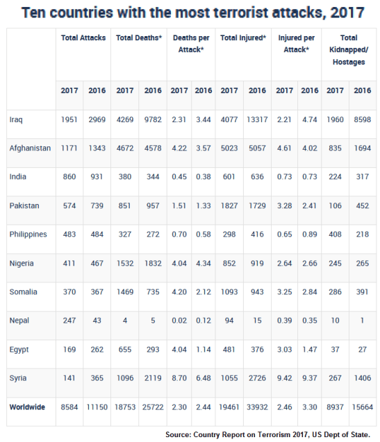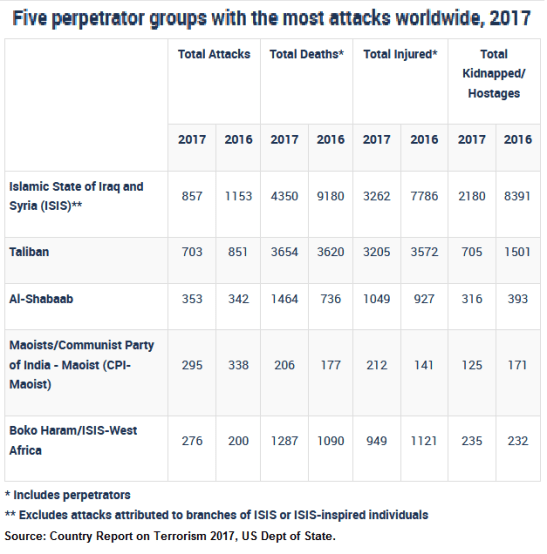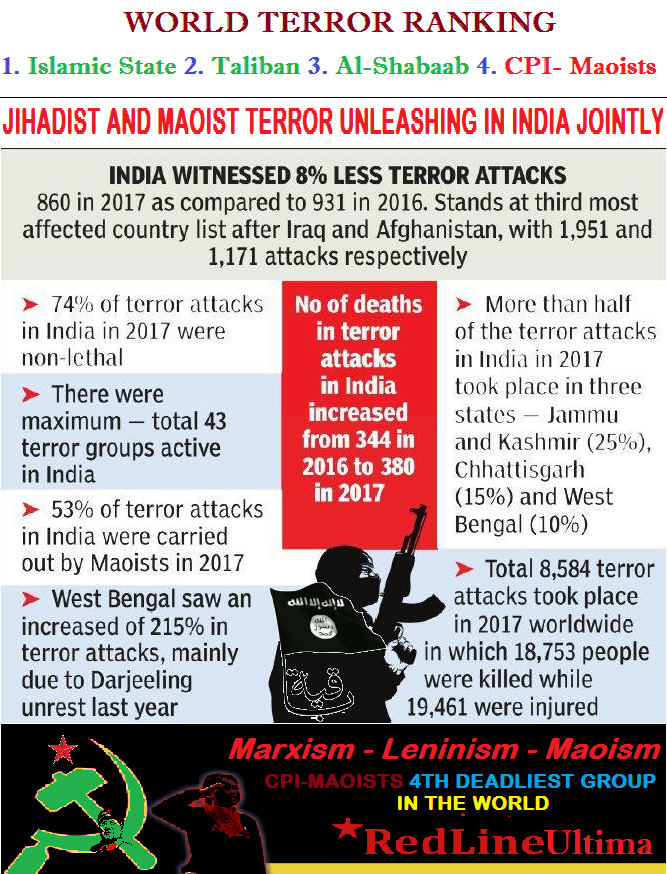 Neeraj Chauhan | TNN | New Delhi | Sep 22, 2018:: For second year in a row, India is the third largest victim of terror attacks across the world after Iraq and Afghanistan while CPI- Maoists, which carried out 53% of the total attacks in India , is the fourth deadliest terror group after Islamic State, Taliban and Al-Shabaab, according to the data released by US department of state+ on Thursday.