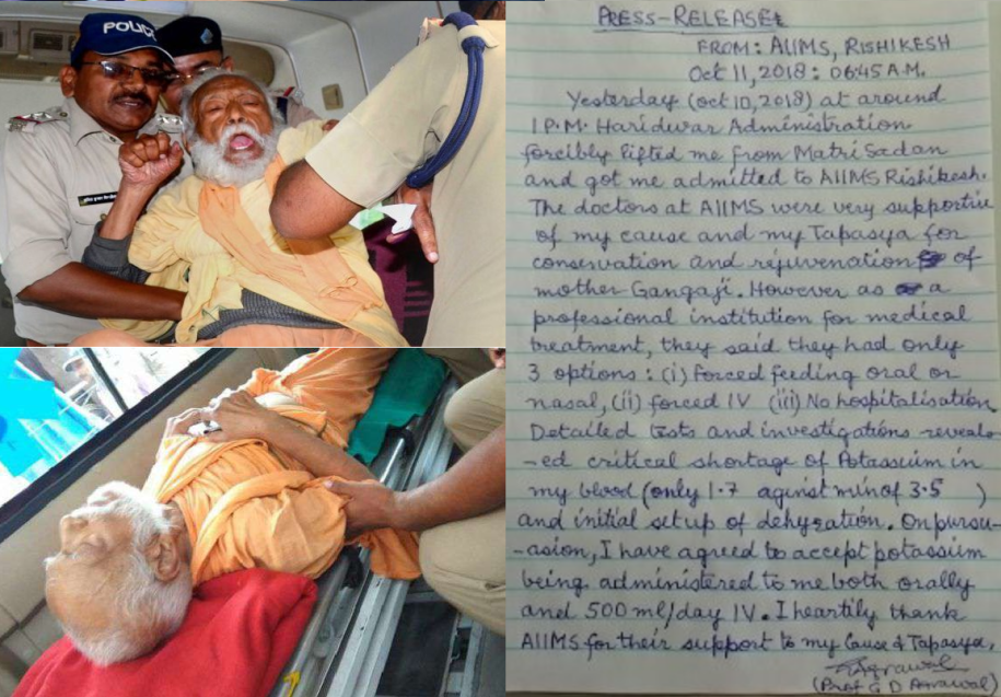 Swami died at the All India Institute of Medical Sciences in Rishikesh within 24 hours after he was forcefully admitted there by the Uttarakhand Police last night. On Wednesday he was forcibly shifted to the AIIMS hospital from his Matri Sadan Ashram after his health deteriorated significantly when he even stopped drinking water from the first day of Navaratri as Central or Uttarakhand State Govt, nobody gave any importance on the causes upon which he was on fasting. The way Police lifted the Swami in a hanging condition and dumped into an ambulance which could be the major cause of worsening the health of the Swami, aged 86 years.