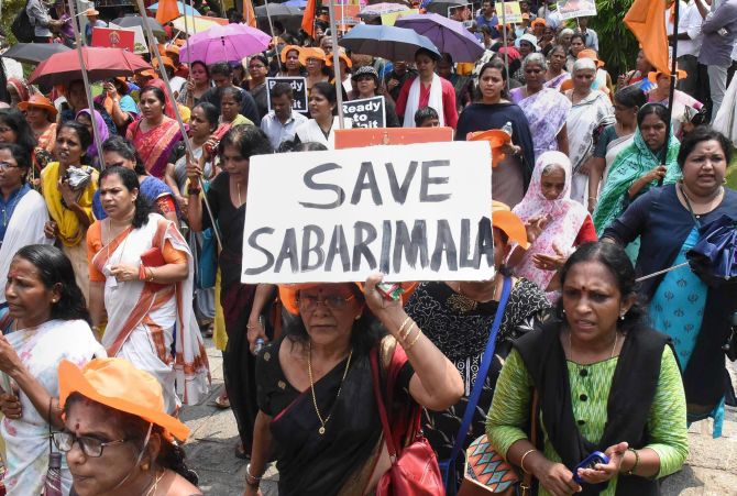 IMAGE: Devotees, mostly women, take part in the namajapa (chanting the name of Lord Ayyappa) march against the Supreme Court verdict on the entry of women of all ages into the Sabarimala Temple, in Ernakulam. Photograph: PTI Photo