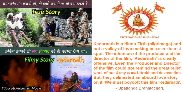 Prominent Hindu interlocutor and Hindu Existence Website Editor, Upananda Brahmachari welcomed the legal steps taken by AntarRashtriya Hindu Sena (International Hindu Sena) against the release of the film “Kedarnath” and challenged the Mumbai Producers and Directors to make a Love Story Film setting the background as Haj and Umrah or in a set of Haji Ali or Ajmer Sharif.