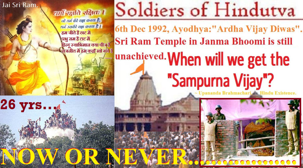 On December 6th of 1992 in Ayodhya, by demolishing the ”ILLEGAL” and “DISPUTED” Babri Structure, We, the Karsewaks, liberated and reclaimed our rightful Holy Hindu shrine, Sri Ram Janma Bhoomi, Lord Rama’s Holy Birth Place. Since then 6th December is celebrated as ‘Vijay’/’Shourya’ Diwas – ‘Victory Day’ or ‘Valour Day’ by Hindu’s all over India. But after 26 years that VIJAY is still incomplete and it may termed as an ‘Ardha Vijay Diwas’ as it is a Victory in a half done condition.