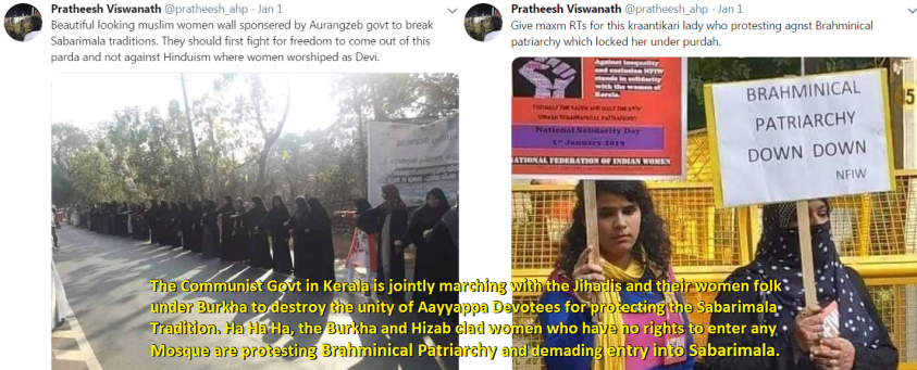 The Communist Govt in Kerala is jointly marching with the Jihadis and their women folk under Burkha to destroy the unity of Aayappa Devotees for protecting the Sabarimala Tradition. CPIM led Govt in Kerala depolyed the Burkha and Hizab clad women who have no rights to enter any Mosque for protesting ‘Brahminical Patriarchy’ and ‘Hindu customs’ in Sabarimala.