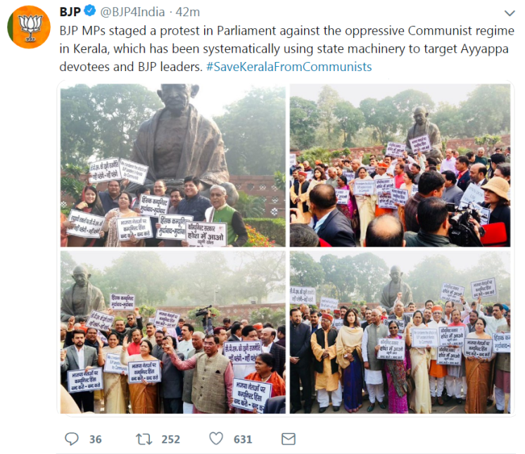 BJP MPs staged a protest in the Parliament complex today+ against incidents of violence targeting Ayyappa Devotees and their leaders in Kerala, including a crude bomb thrown at the residence of Rajya Sabha MP V Muraleedharan which they blamed on the state’s CPI-M led government.
