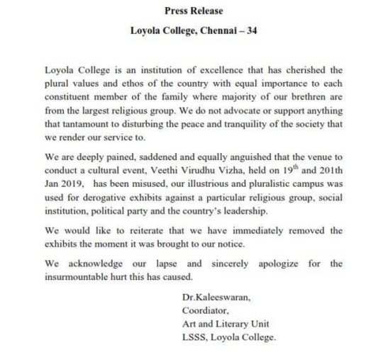 According to coordinator, Art & Literary Unit, LSSS, Loyola College, Dr Kaleswaran, “We would like to reiterate that we have immediately removed the exhibits the moment it was brought to our notice.”