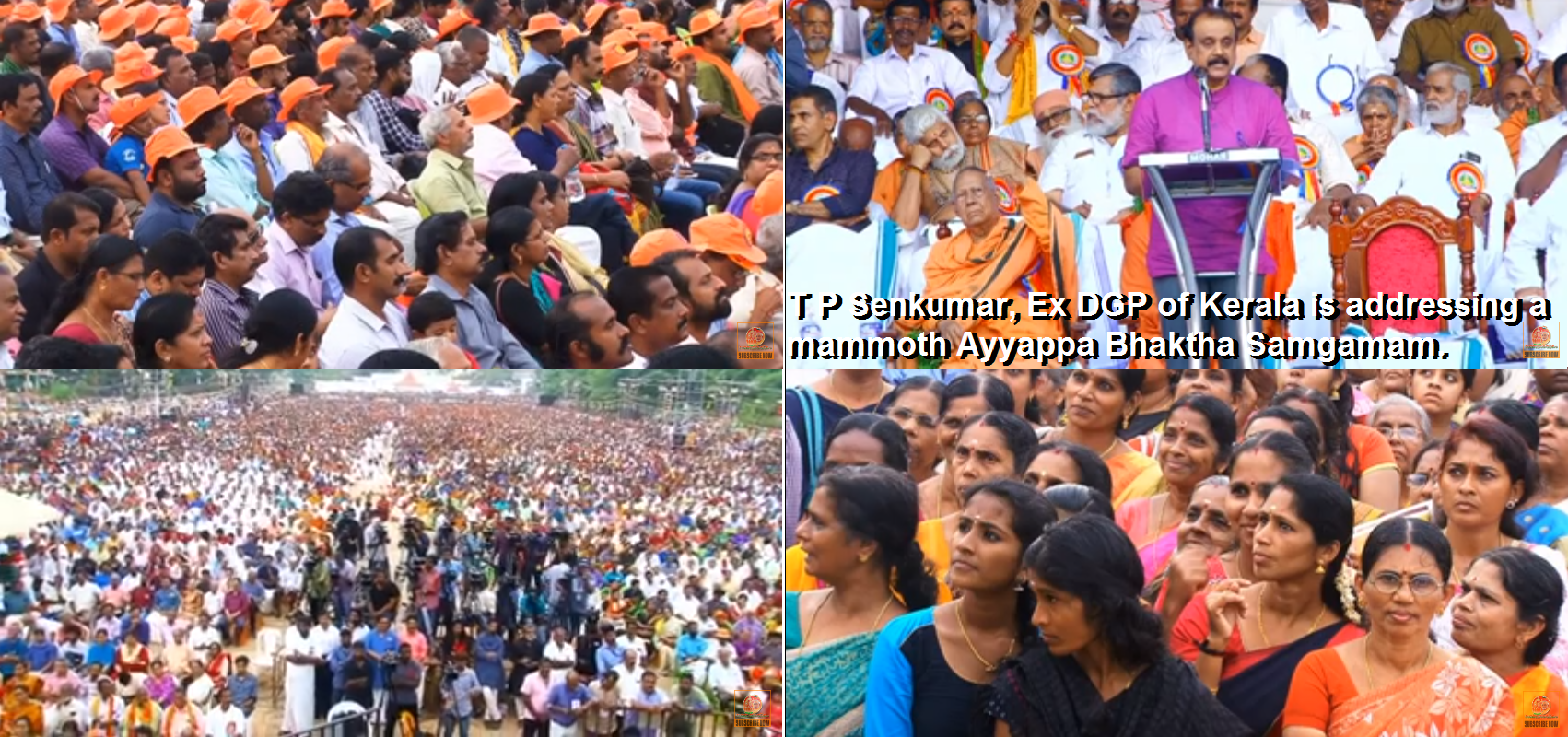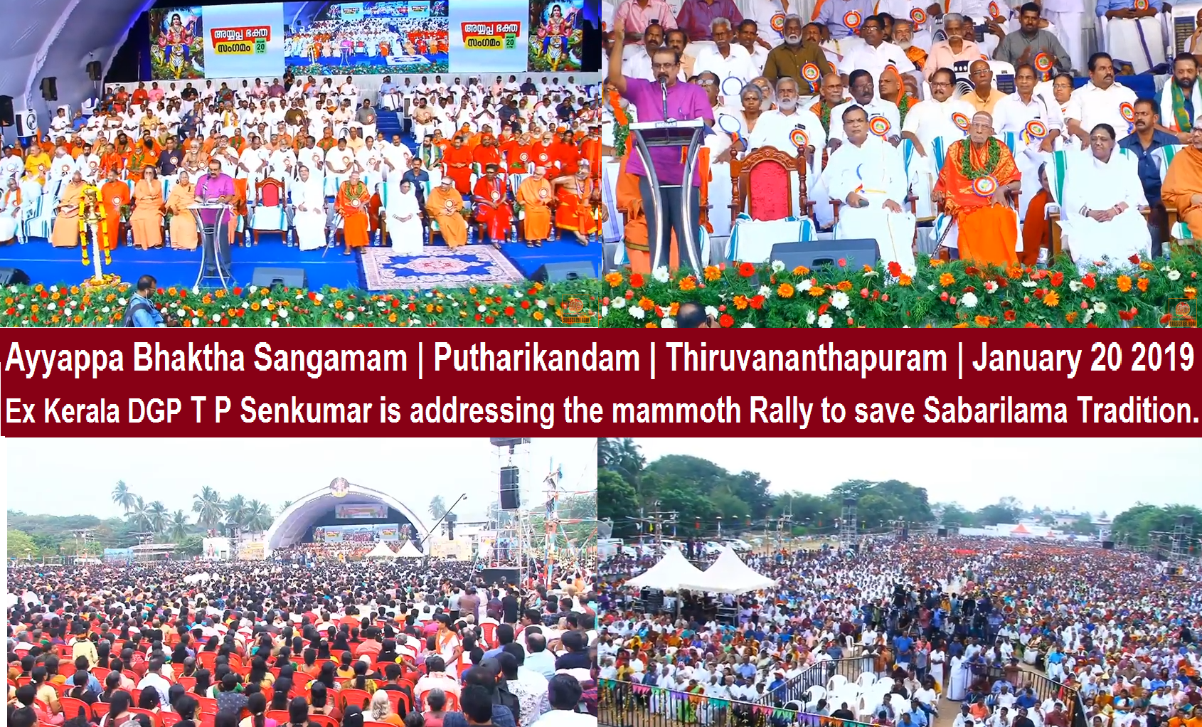 Kumar Chellappan | Daily Pioneer Online | Thiruvananthapuram | Jan 21, 2019:: T P Senkumar, the then Director General of Police, Kerala, who also headed the Intelligence Wing , cautioned the Ayyappa devotees on Sunday that the agitation for preserving traditions and customs at Lord Ayyappa Temple at Sabarimala was the last opportunity to save the Sanatan Dharma. Addressing a mammoth rally named Ayyappa Bhaktha Samgamam at the historical Putharikandam Maidan in the Capital city, Senkumar warned the devotees that the next target of the Kerala Government would be Sri Padmanabha Swamy Temple which is believed to own treasure worth more than Rs 1,50,000 crore.