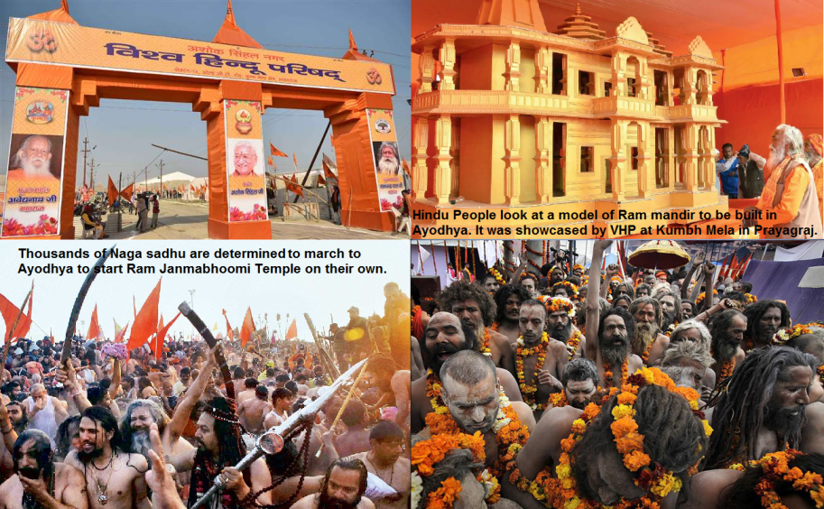 Feeling the Ram Mandir heat even the low temperature of Kumbh environ, the managers in VHP have decided to balance the fate of Modi govt in 2019 and the high urge of the Hindu society for Ayodhya Ram Temple through a a declaration of the “starting of Ram Janmabhoomi Temple on Ramnavmi next+” in the upcoming Dharma Sansad (31 Jan- 1 Feb), where thousands of Hindu Sadhus and leaders will assemble during Kumbh Mela in Praygraj.