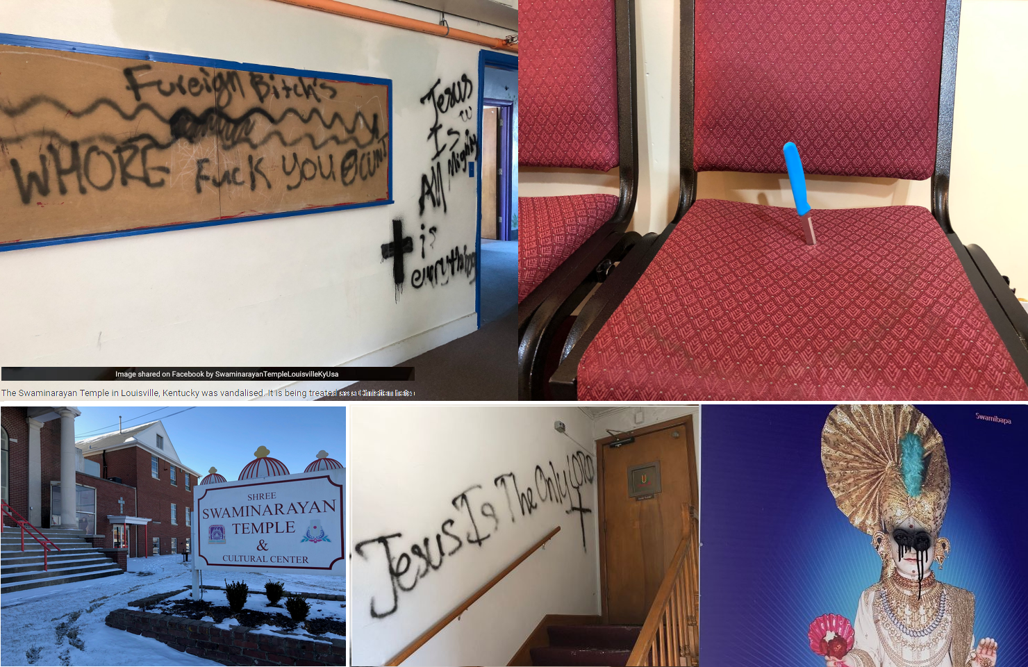 Swadesh Mathur | HENB | Washington | Jan 31. 2019:: A Hindu temple has been vandalized in the U.S. state of Kentucky by Christian fundamentalists who sprayed black paint on the deity and left a knife stabbed into a chair in the main hall. The incident happened between Sunday night and Tuesday morning at the Swaminarayan Temple in the Louisville city. According to local media report, vandalism resulted in deity image sprayed with black paint, broken windows, walls painted with filthy language like, “foreign bitch’s whores fuck you…” after writing of fanatic dictum like, ‘Jesus is the only Lord”!