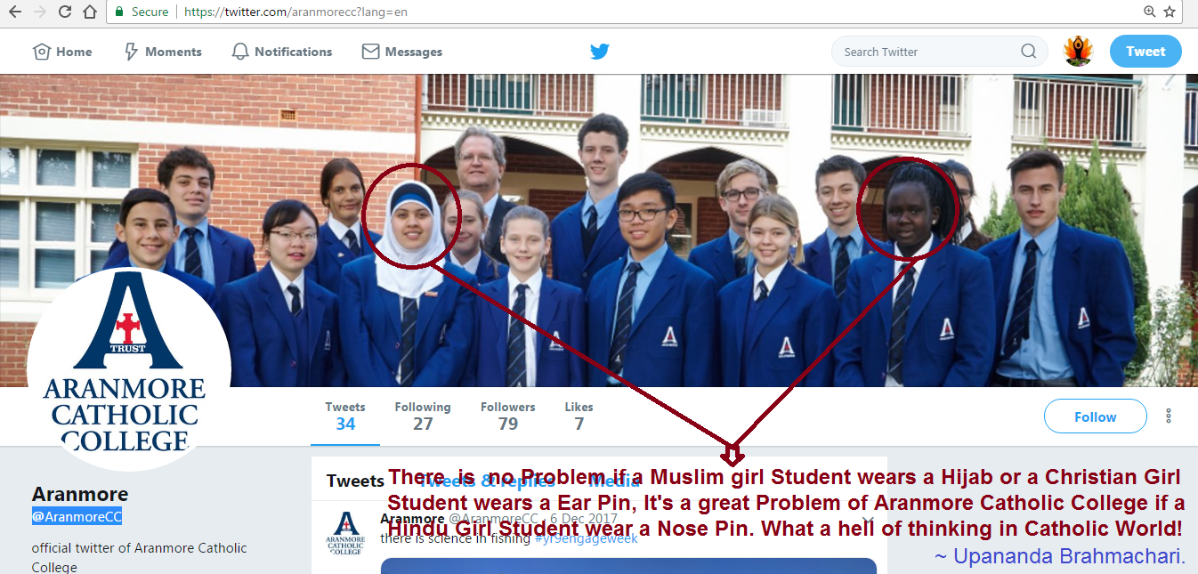 It is seen in banner (header photo) of the Aranmore Catholic College twitter handle @AranmoreCC that Muslims girls students are allowed ‘Hijab’ and Christian Girl students are allowed to wear Era pins. But, there is only hell in the Aranmore Catholic College, if any Hindu girl student wears a nose pin as per her religious custom!