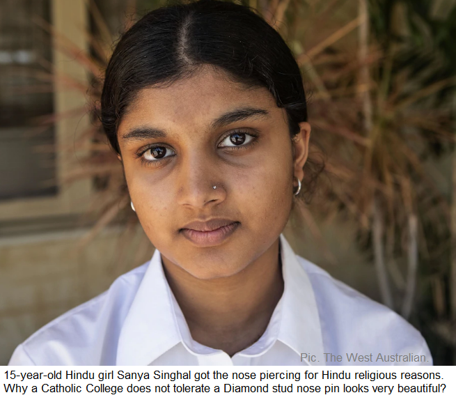 On Tuesday, the first day of school at Aranmore Catholic College, Sanya Singhal, 15, was ordered to remove the tiny new stud in her left nostril or go home.