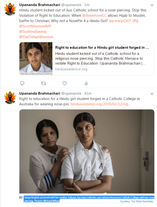 On behalf of Hindu Existence Forum, the Australian PM Scott Morrison (@ScottMorrisonMP), The Australian Education Minister Dan Tehan (@DanTehanWannon), Indian External Affairs Minister Sushma Swaraj (@SushmaSwaraj) and Aranmore Catholic College (@AranmoreCC) have been addressed formally and through Social Media to take proper action so that the study rights of a Hindu student can’t be damaged only for practicing a Hindu custom on her own. Right to education can’t be forged on any discriminatory ground on the basis of religious practice or personal faith and custom.