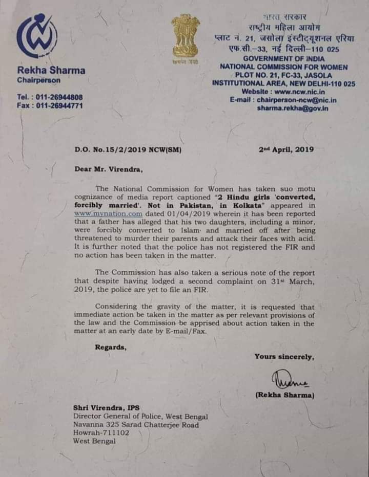 Uttara Sengupta | HENB | Kolkata | April 3, 2019:: As an assertive effect of a media report as flashed in MyNation that two Hindu girls, including one minor, were forcibly converted to Islam and married off in Kolkata, according to a complaint, the National Commission for Women on Tuesday took “suo motu cognisance” and urged the WB director general of police to take “strict and immediate action”.