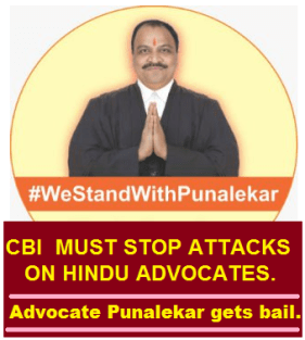 It may be recalled that CBI had arrested Adv. Sanjiv Punalekar and RTI activist Vikram Bhave on 26rd May in Narendra Dabholkar murder case. Hindus all over India have protested against such unjust arrest of Adv. Punalekar and Vikram Bhave by CBI. Finally, due to God’s grace and efforts of devout Hindu advocates like Adv. Subhash Jha, Adv. Ghanshyam Mishra, Adv. Virendra Ichalkaranjikar; Adv. Punalekar ji has been granted bail. The advocates in Hindu VIdhidnya Parishad, Hindu Front for Justice and Hindu Existence Forum have been protesting the purported arrest of Adv. Punalekar from the day one under a very highhandedness of some CBI officials.