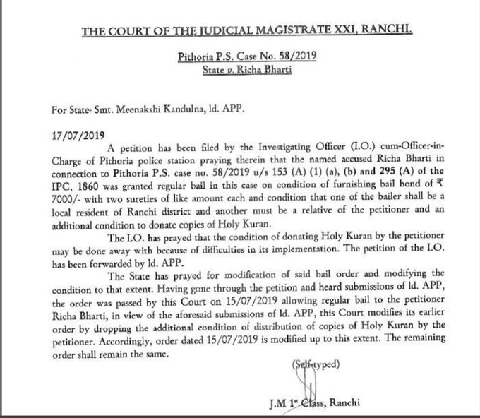 “The State has prayed for modification of said bail order and modifying the condition to that extent. having gone through the petition and heard submission of ld. APP, the order was passed by this Court on 15/07/2019 allowing regular bail to the petitioner Richa Bharti, in view of the aforesaid submission of ld. APP, this Court modifies its earlier order by dropping the additional condition of distribution of copies of Holy Kuran by the petitioner.’