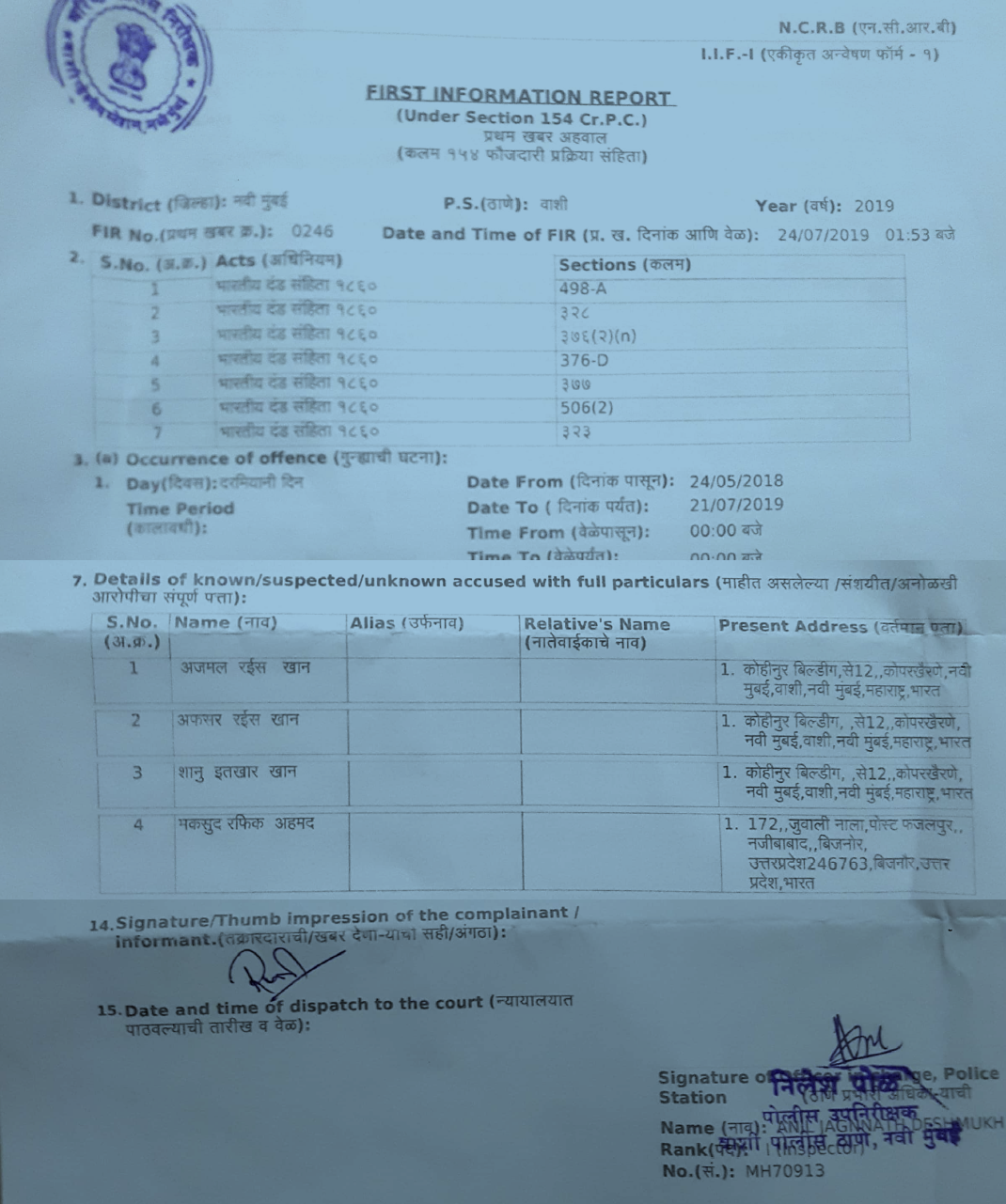 However, Police has lodged an FIR (No 0246/2019 of Vashi PS) against the four accused under various sections of IPC viz. 498 A, 328, 376 (2) (n) , 376 D, 377, 506 (2) and 323.