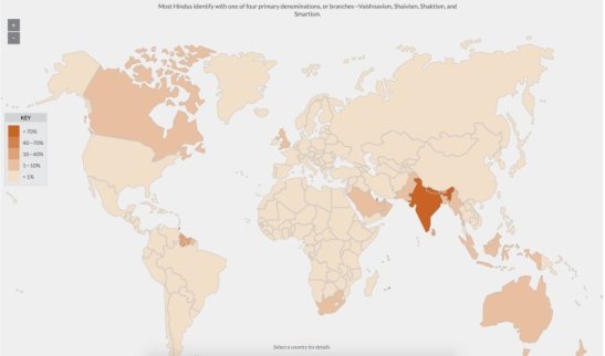The interactive map by PBS visually displays the countries of the world and the dominant religions in those countries. While the extent of the spread of Christianity is evident by the ocean of purple, Hinduism and Islam deserve a closer look.