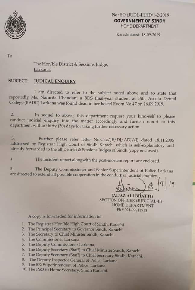 However, The Sindh Govt initiated a judicial probe on the mysterious death of Nimrita Amarta Maher Chandani Kumari to reveal the truth of the most unfortunate and untimely death of a promising girl student in BDS discipline.
