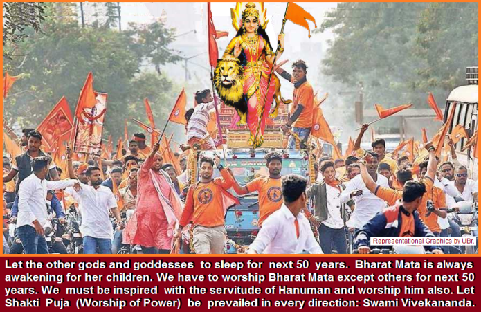 The VHP leader from the organizers told further that Swami Vivekananda wanted ‘Worship of Bharat Mata’ in every direction. “Let the other gods and goddesses to sleep for next 50 years. Bharat Mata is always awakening for her children. We have to worship Bharat Mata except others for next 50 years. We must be inspired with the servitude of Hanuman and worship him also. Let the Shakti Puja (Worship of Power) be prevailed in every direction,” the enthusiastic VHP leader was quoting from Swami Vivekananda as told his disciples and the young generation of India!