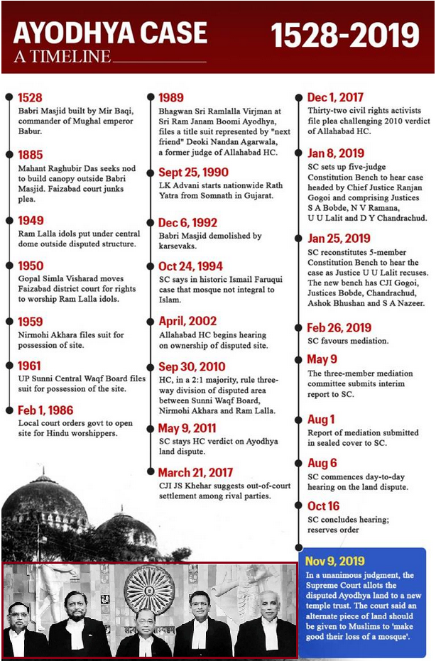 The Civil Appeal Nos 10866-10867 of 2010 being M Siddiq (D) Thr Lrs …Appellants -Versus- Mahant Suresh Das & Ors …Respondents WITH Civil Appeal Nos 4768-4771/2011; Civil Appeal No 2636/2011; Civil Appeal No 821/2011; Civil Appeal No 4739/2011; Civil Appeal Nos 4905-4908/2011; Civil Appeal No 2215/2011, Civil Appeal No 4740/2011; Civil Appeal No 2894/2011; Civil Appeal No 6965/2011; Civil Appeal No 4192/2011; Civil Appeal No 5498/2011; Civil Appeal No 7226/2011 AND Civil Appeal No 8096/2011 pending the apex court for years finally came to an end for the decision featuring the main ten points noted below: