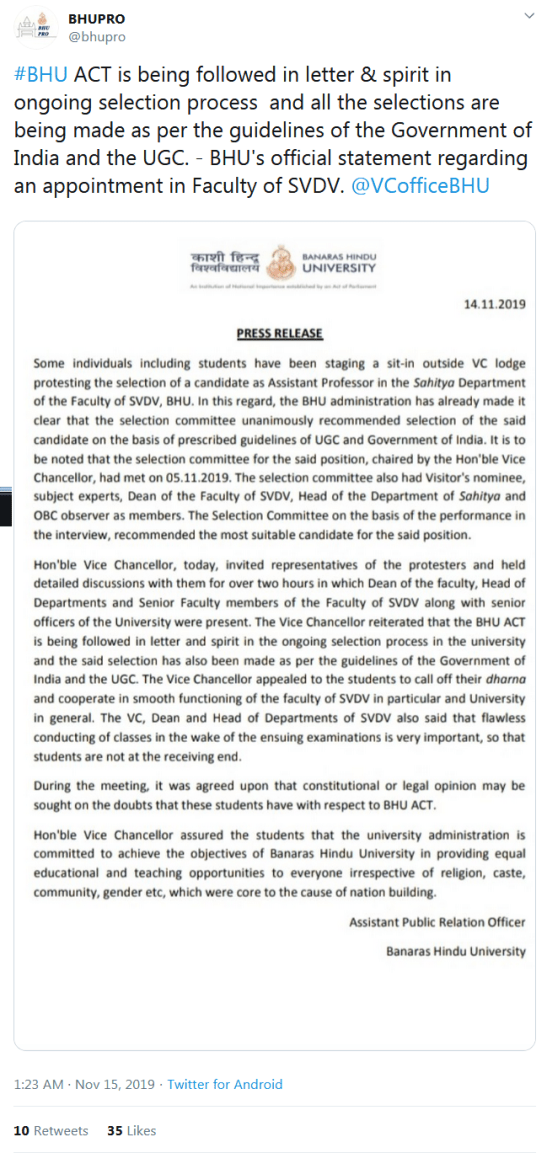 BHU spokesperson Dr Rajesh Singh has also issued a statement on behalf of the institute to the media on appointment of Dr Firoz Khan. He informed that in the selection committee meeting chaired by the Vice Chancellor, subject experts found Dr Firoz Khan eligible for the post of an Assistant Professor after adopting a transparent process. The spokesperson said that BHU was established with the objective to provide equal opportunities for studies and teaching for the nation to rise above the discrimination of religion, caste, creed, gender etc. This objective is being pursued by the BHU administration in appointment of Dr Khan.