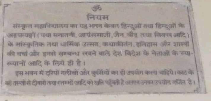 The rule at the ‘sheela-lekh’ at BHU which states only those who follow Sanatan Dharma can partake studies at the SVDV in BHU (image: hindi.opindia.com)