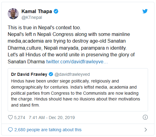 Calling for Hindus of the world to stand against the left and preserve the glory of the Sanatan Dharma, the leader of Rashtriya Prajatantra Party of Nepal Kamal Thapa took to Twitter on December 20 to write: “This is true in Nepal’s context too. Nepal’s left and Nepali Congress along with some mainline media, academia are trying to destroy age-old Sanatan Dharma, culture, Nepali Maryada, parampara and identity.”