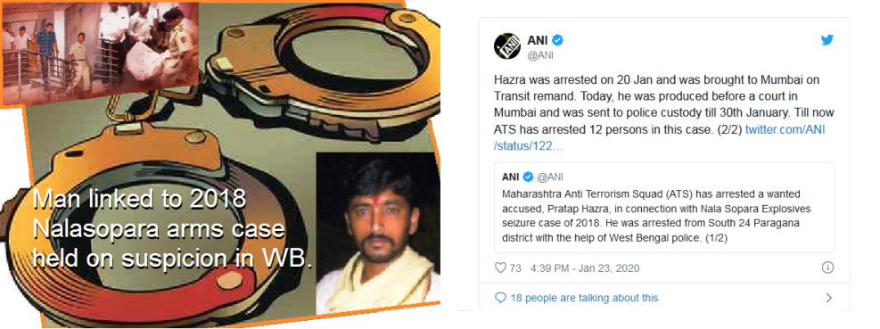Maharashtra Police arrested Pratap Judishtar Hajra alias Pratap Hajra, a resident of West Bengal, from South 24 Parganas district with assistance from West Bengal Police. Hazara is believed to be connected with different Hindutvawadi organizations viz. Hindu Samhati, Bhavani Sena, Hindu Janajagruti Samiti and AntarRashtriya Hindu Parishad based in West Bengal, Maharashtra and Gujarat .