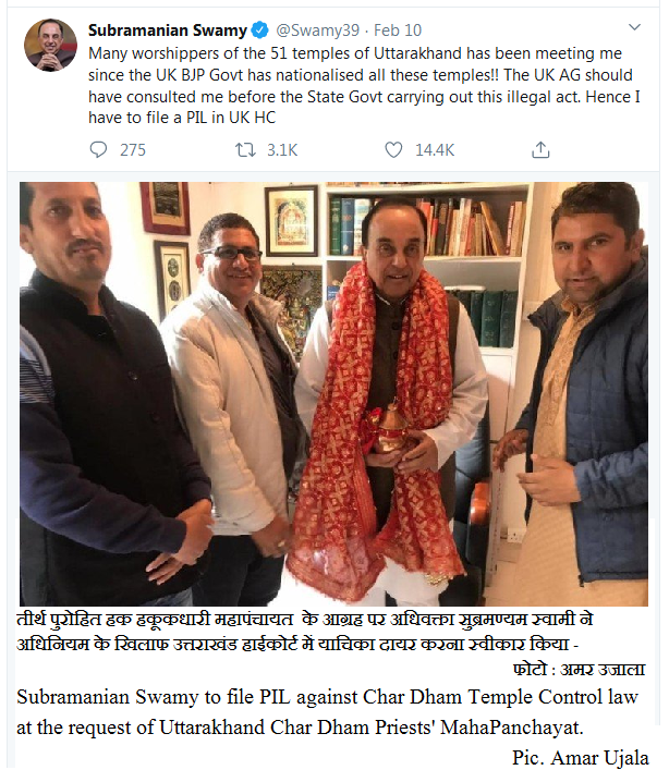 In his most popular Tweeter handle Swamy expressed, “Many worshippers of the 51 temples of Uttarakhand has been meeting me since the UK BJP Govt has nationalised all these temples!! The UK AG should have consulted me before the State Govt carrying out this illegal act. Hence I have to file a PIL in UK HC“.